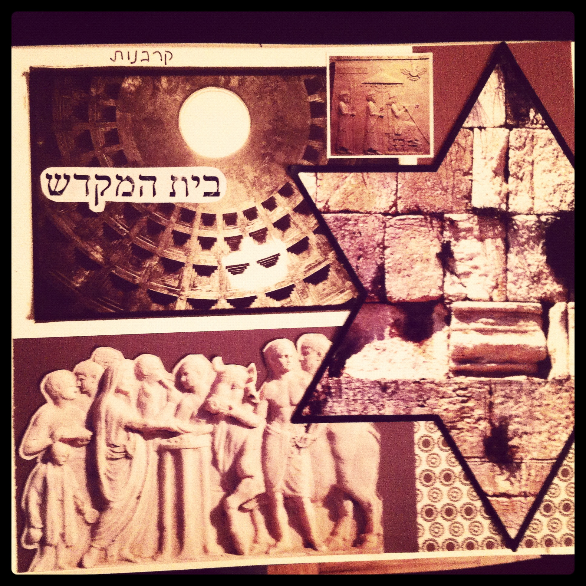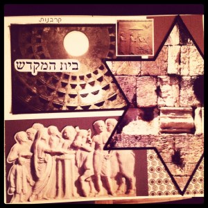 As part of what I would describe as a liberal Judaism, I am uncomfortable with references to the Temple that indicate a longing for its return – which I would suggest that these do. Thus, I appreciated the fact that we did not focus on the prayers themselves; it is unlikely that I will incorporate them into my practice. My ambivalence about the prayers is reflected in my collage (above), into which I incorporated photographs of temples that don’t cause me so much consternation: the Pantheon in Rome and the altar of Vespasian in Pompeii.