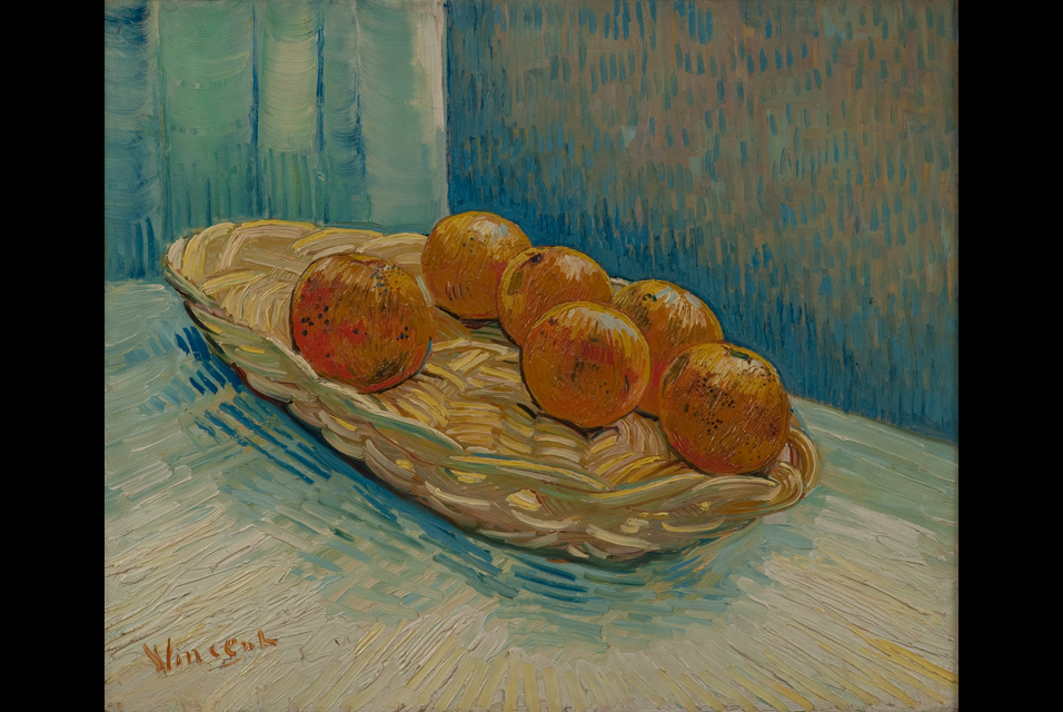 And now I know that what’s odd about this is that Van Gogh, early in his apprenticeship, did not employ color much at all; his early works can only be described as drab — the palette related to his choice of subject, everyday working folk, whom he desired both to realistically portray and to ennoble as sufferers of the human condition. The Potato Eaters, which was included in the exhibit, is a good example of this early work. It was only after he studied color theory and became obsessed with Japanese woodcuts that his paintings began to evidence the bright hues that would later become his signature. One of my favorites from the exhibit (besides Basket with Six Oranges above) was Landscape Under a Stormy Sky.