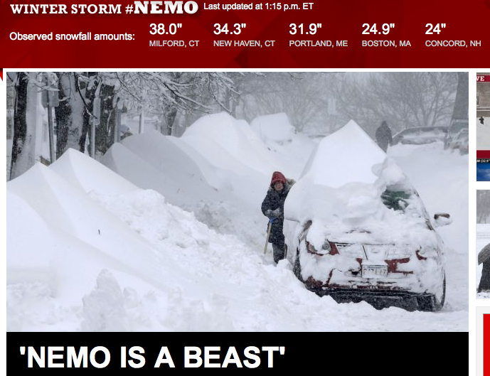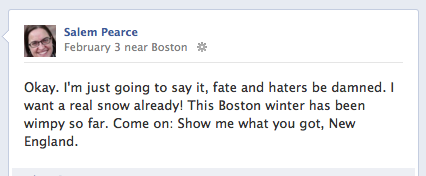 Putting aside the absurdity of naming a historic blizzard (so far the fifth worst in Boston history) after a cartoon fish, I am still excited about this big snow (even as I am not looking forward to shoveling out the car). I got a day off from school on Friday, and the snow is absolutely beautiful. We still have power, heat, and, most importantly, internet. But my friend Stacey lost power — along with another quarter of a million people. And as of Saturday evening it was still snowing in Maine, where our friend Jackie lives; the snow drifts there are taller than her 18-month-old daughter. And one day of Ta Sh’ma, the school’s prospective student open house, has been cancelled.