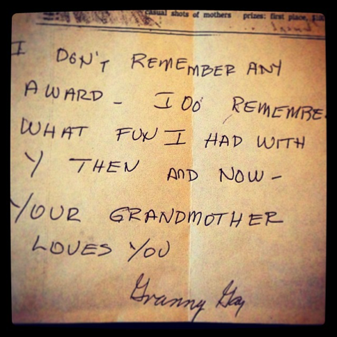 a note from my grandmother, in her familiar handwriting, about the picture of us (above) that won a Mother’s Day photo contest in the Houston Post; photo by salem pearce via instagram